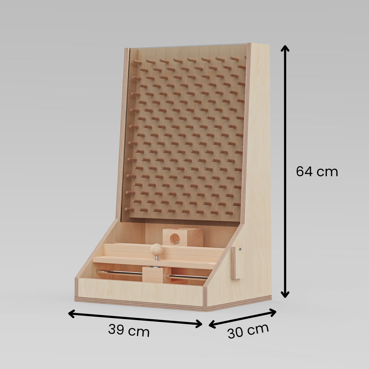 Das Kugel-Fangspiel ist 39 cm breit, 64 cm hoch und 30 cm tief.